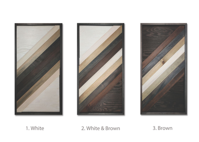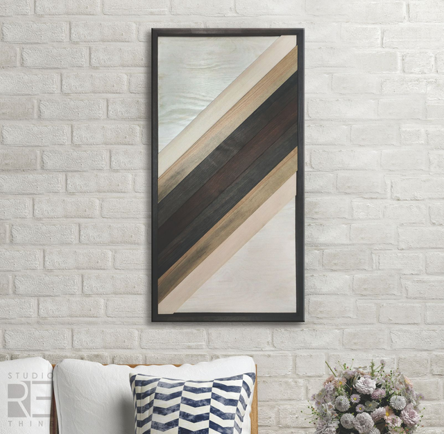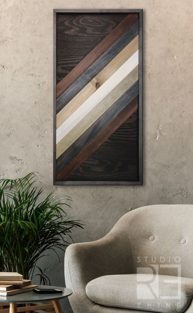 Minimalistyczna dekoracja ścienna łącząca prostotę geometrycznych form z naturalnym ciepłem drewna. Obraz powstał na tle ze sklejki, na którym ułożona jest przestrzenna kompozycja z litego drewna sosnowego.