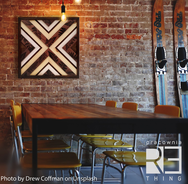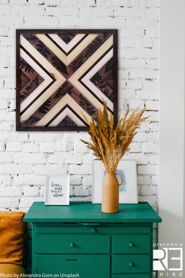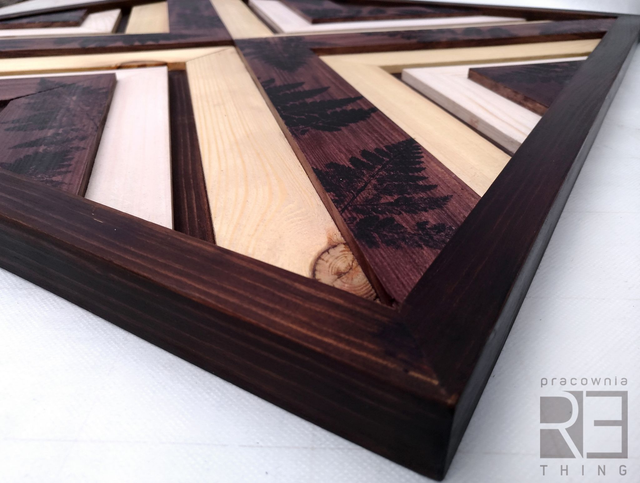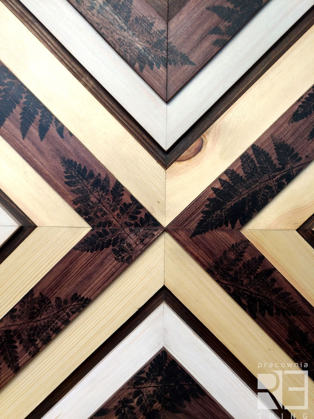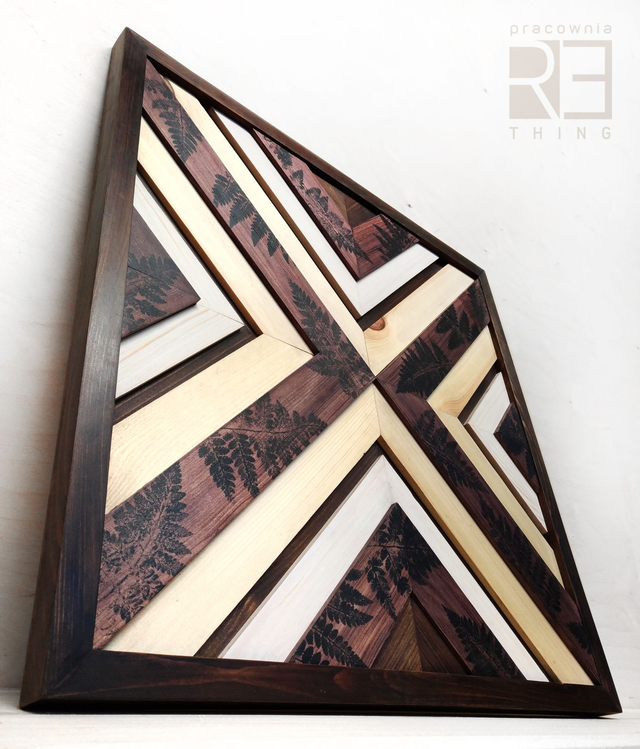 Ręcznie wykonana drewniana dekoracja ścienna o przestrzennej formie, stworzona z listewek barwionych w naturalnych tonacjach. Wybrane elementy ozdobiono unikatowym, ręcznie nanoszonym wzorem liści paproci, co nadaje całości subtelnego leśnego charakteru. To obraz z drewna, który łączy naturę z rzemiosłem – idealny do wnętrz w stylu rustykalnym, boho i japandi.