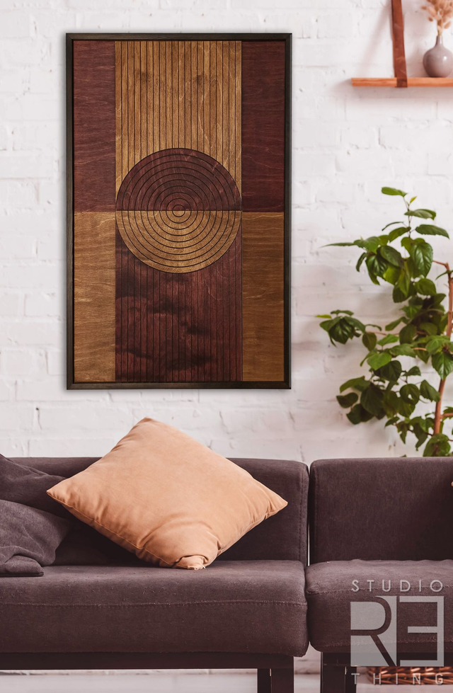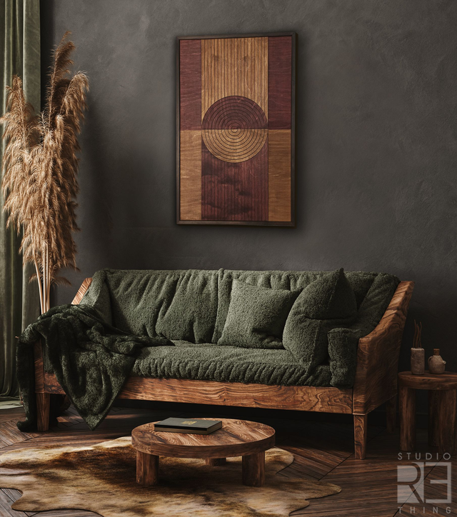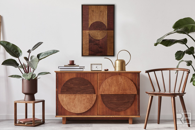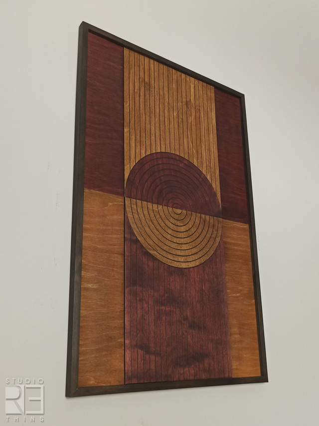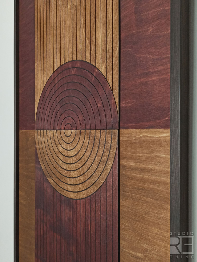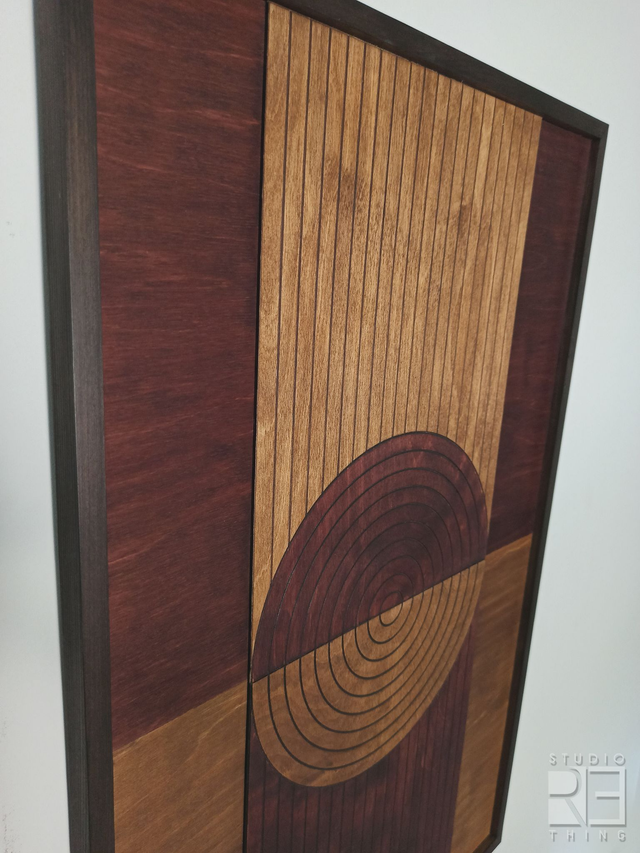Nowoczesna dekoracja ścienna z geometrycznym wzorem, łącząca minimalizm z wpływami stylu mid-century. Falujące usłojenie, głębia barw i naturalna faktura drewna tworzą elegancką kompozycję, która wprowadza do wnętrza równowagę, rytm i wyrazisty charakter.