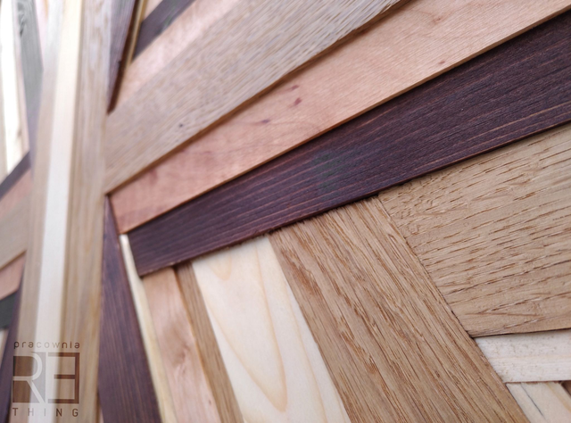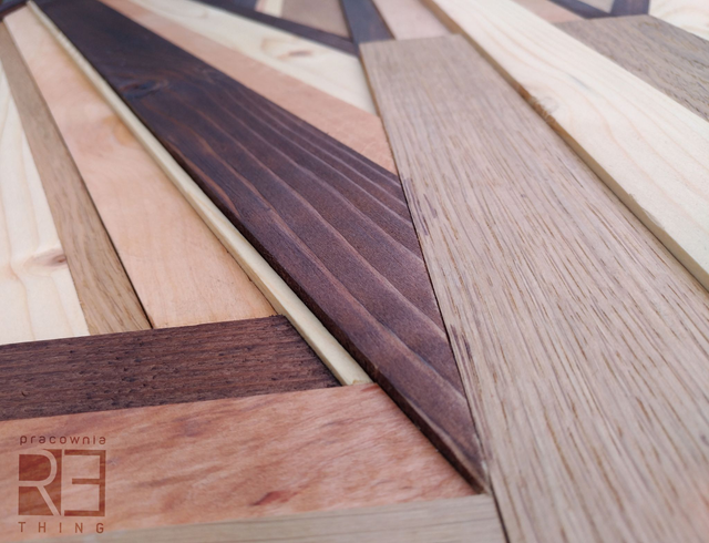 – Część sosnowych listewek barwiona ciemną bejcą, reszta w naturalnych kolorach
