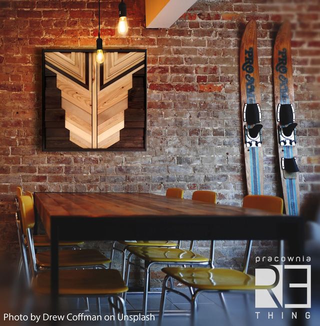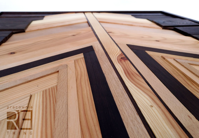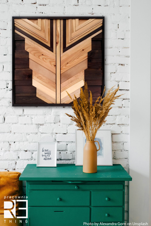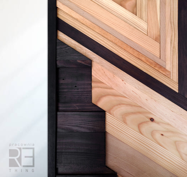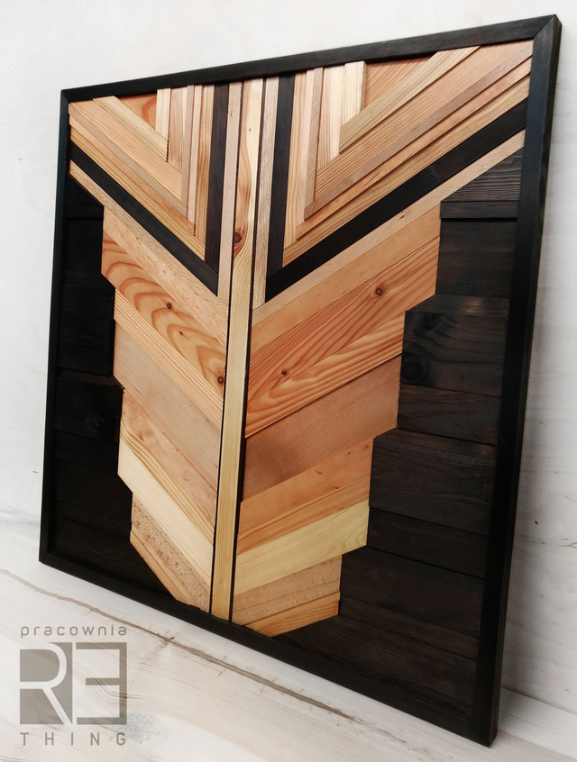 Ręcznie wykonana drewniana dekoracja ścienna stworzona z różnych gatunków drewna: buka, sosny, olchy i modrzewia. Ciemniejsze elementy zostały zabarwione bejcą, pozostałe zachowują naturalne odcienie, nasycone olejowoskiem. Kompozycja oprawiona w ciemną ramę to harmonijne połączenie surowej prostoty z wyrafinowaną formą – idealne do wnętrz w stylu nowoczesnym, skandynawskim czy japandi.