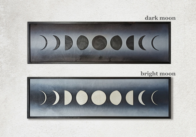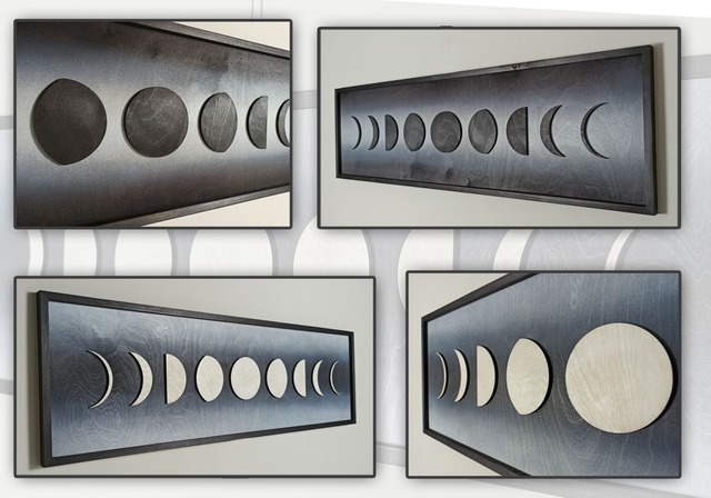 „Księżycowe Kontrasty” to drewniany obraz łączący surowość geometrii z poetyką czerni i bieli. Hipnotyzujący układ faz księżyca i wyrazisty gradient przyciągają wzrok i wprowadzają do wnętrza atmosferę spokoju oraz wyrafinowania.