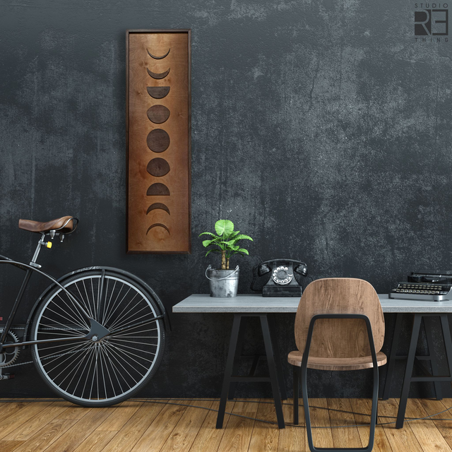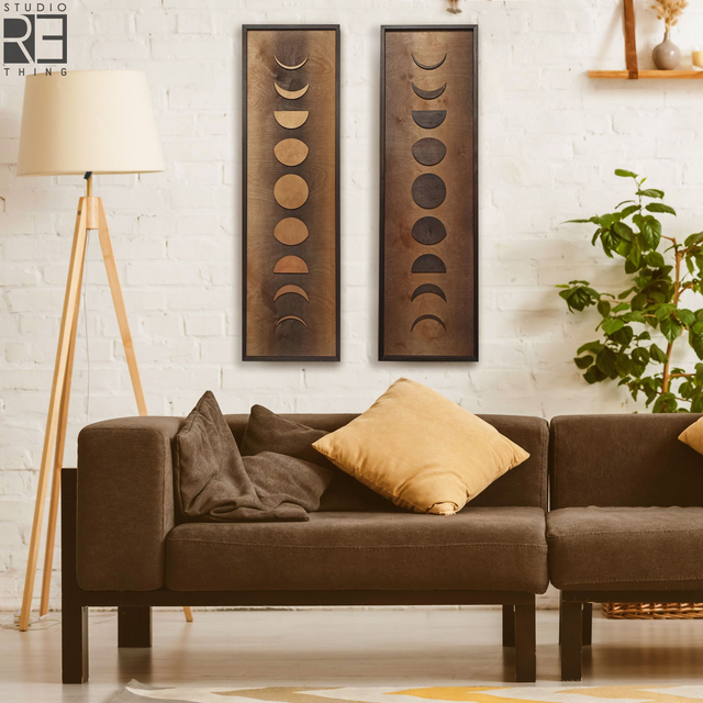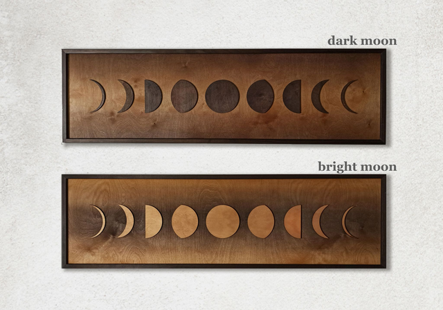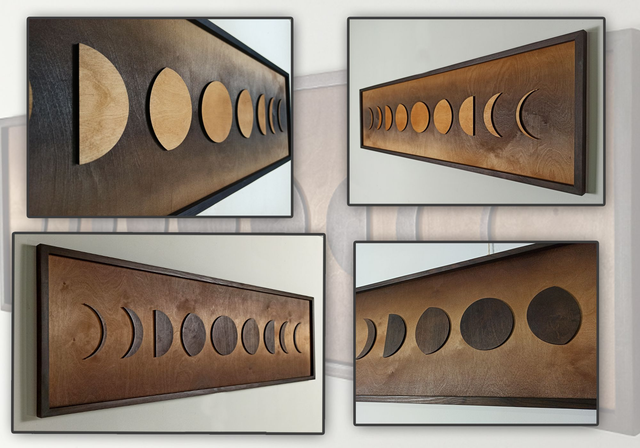 Minimalistyczna, ręcznie wykonana dekoracja ścienna inspirowana fazami księżyca, utrzymana w ciepłych, naturalnych tonach wenge. Ten drewniany obraz to połączenie precyzji formy i głębi barw, które wprowadzą do wnętrza aurę spokoju, harmonii i tajemnicy.