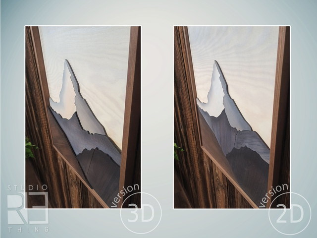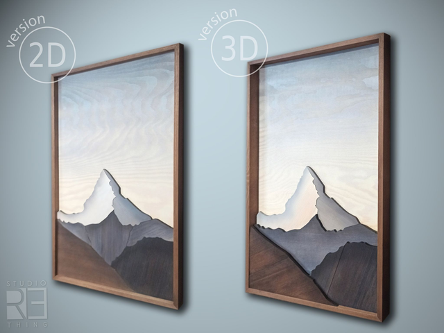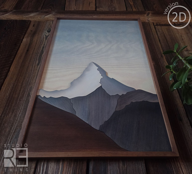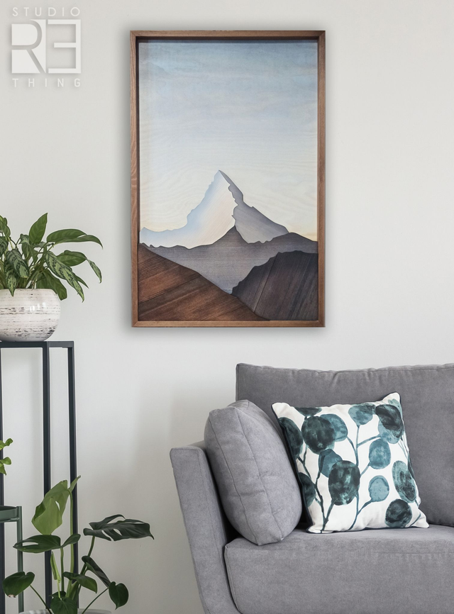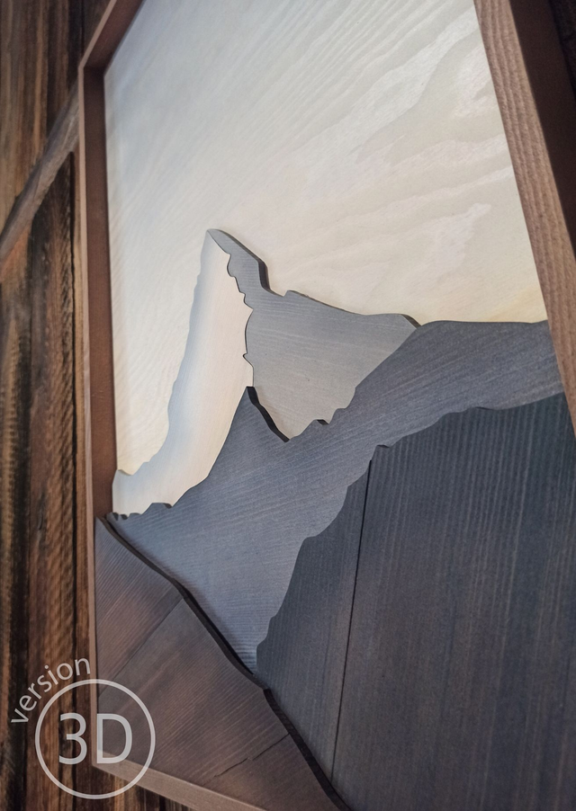 Obraz inspirowany sylwetką Matterhornu – jednej z najbardziej ikonicznych gór Alp. Kompozycja barwionych drewnianych elementów tworzy spokojny, wyrazisty pejzaż o przestrzennym charakterze.