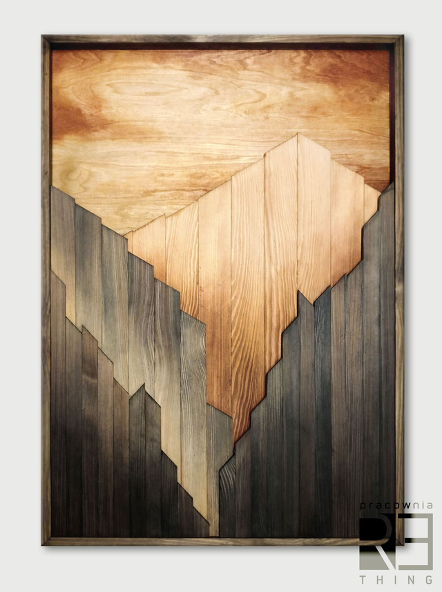 Zainspirowana górskimi szlakami prowadzącymi przez zacienione doliny aż po oświetlone szczyty, ta kompozycja oddaje atmosferę zmierzchu w wysokich partiach gór. Ciepłe niebo z malowanymi chmurami przywołuje ostatnie promienie słońca, które rozświetlają skaliste zbocza i wąskie przełęcze. To propozycja dla tych, którzy cenią naturalną estetykę, strukturę drewna i spokojne, ale sugestywne krajobrazy.