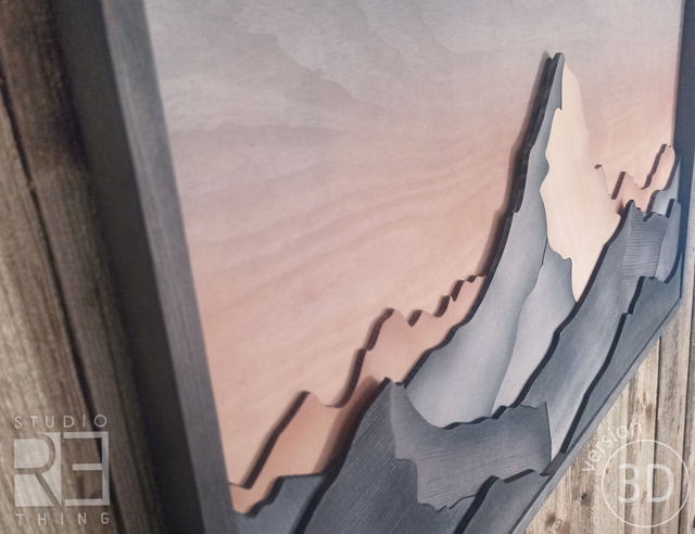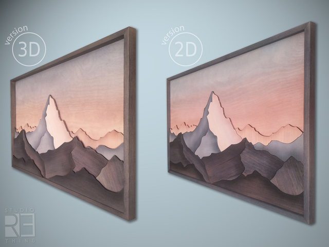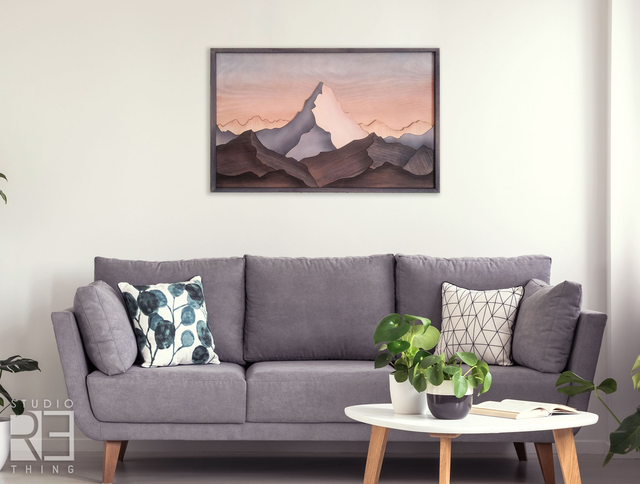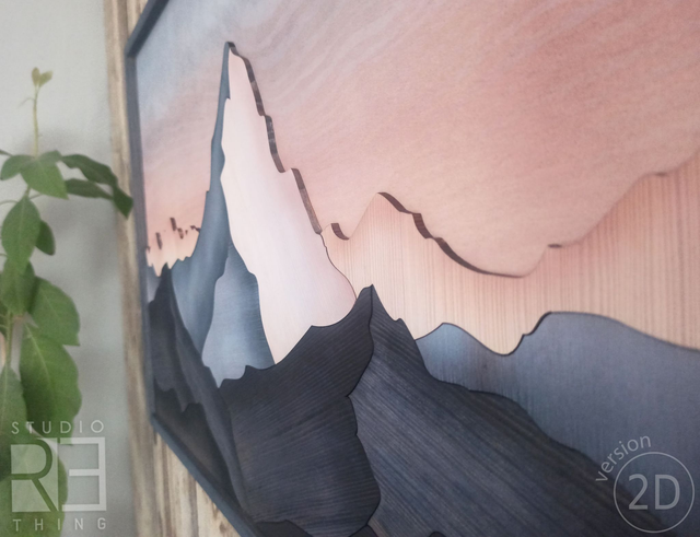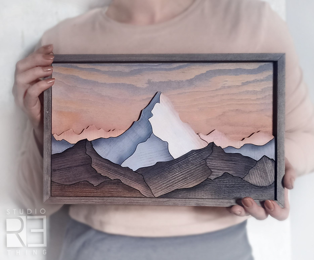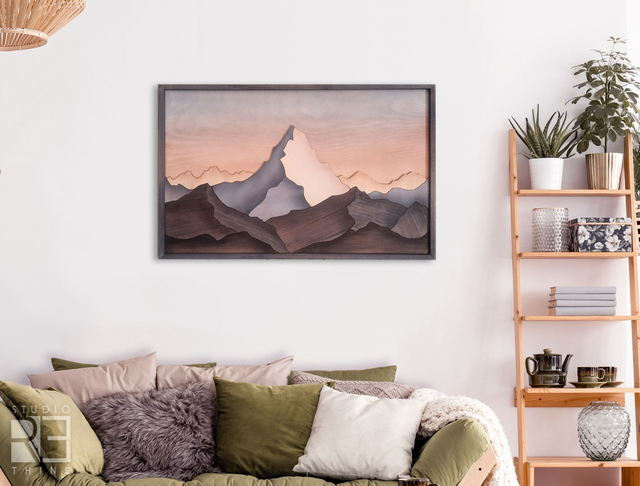 Obraz inspirowany majestatycznym widokiem na Mount Everest — najwyższy szczyt świata. Kompozycja barwionych drewnianych elementów tworzy harmonijny, majestatyczny pejzaż górski o przestrzennym charakterze.