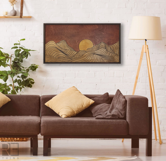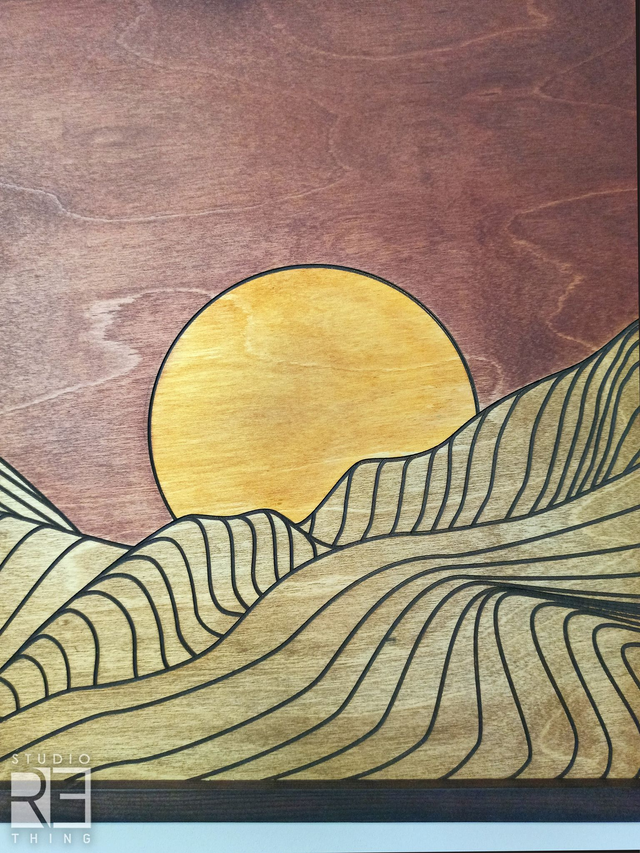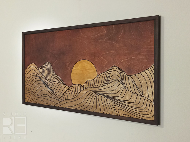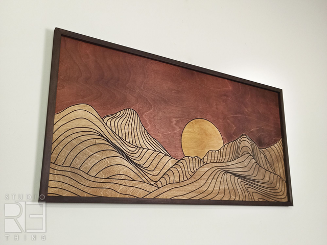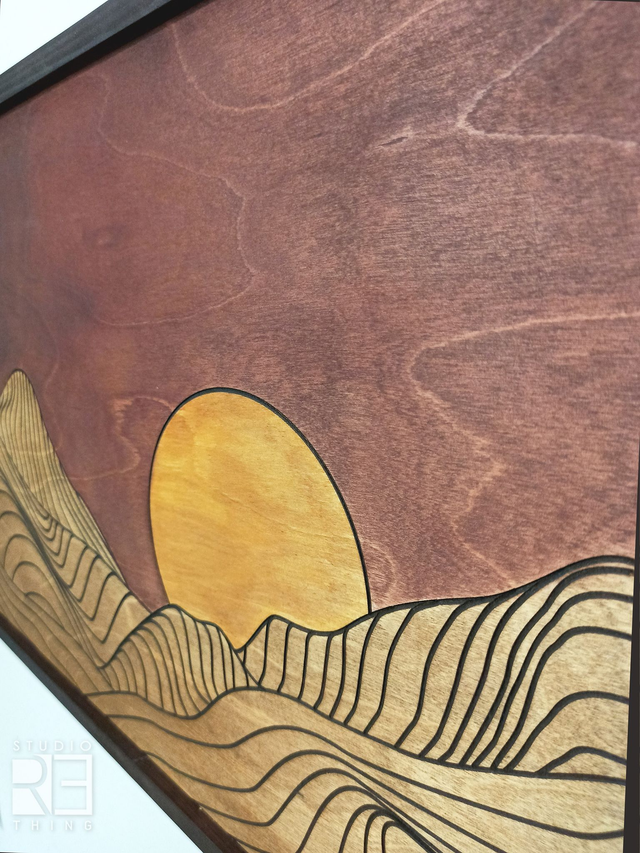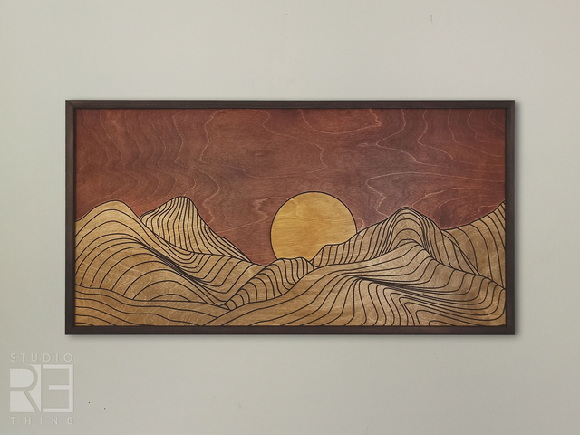 Ten drewniany obraz z motywem gór wyróżnia się grawerowanymi liniami, które tworzą efekt przestrzennej głębi i płynnego ruchu. Każda linia została wypalona w powierzchni sklejki, podążając za naturalnym rytmem krajobrazu – od łagodnych dolin po wyniosłe szczyty. Całość dopełnia ciepłe tło w odcieniach burgundu i złamanych brązów, przywodzące na myśl zachód słońca nad górami.