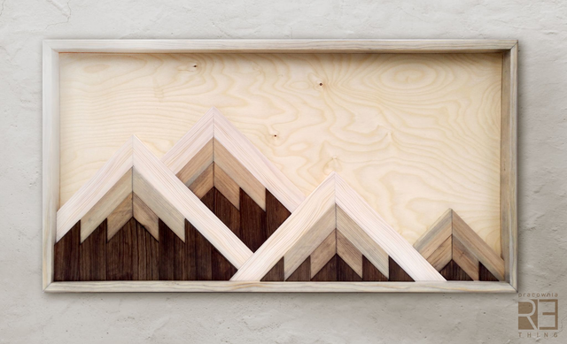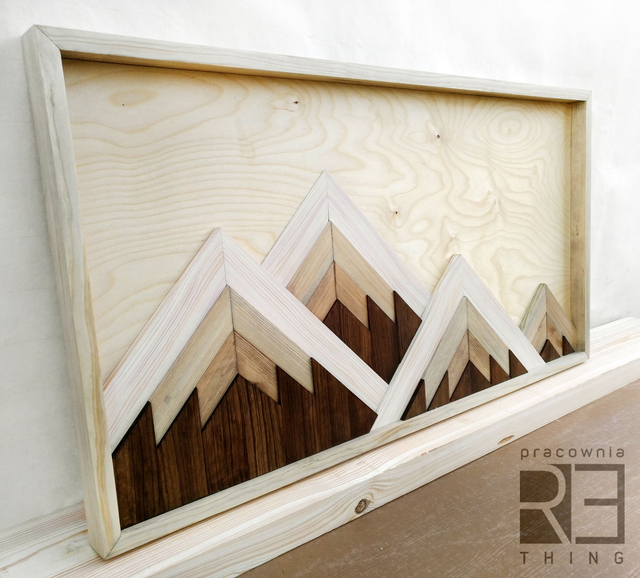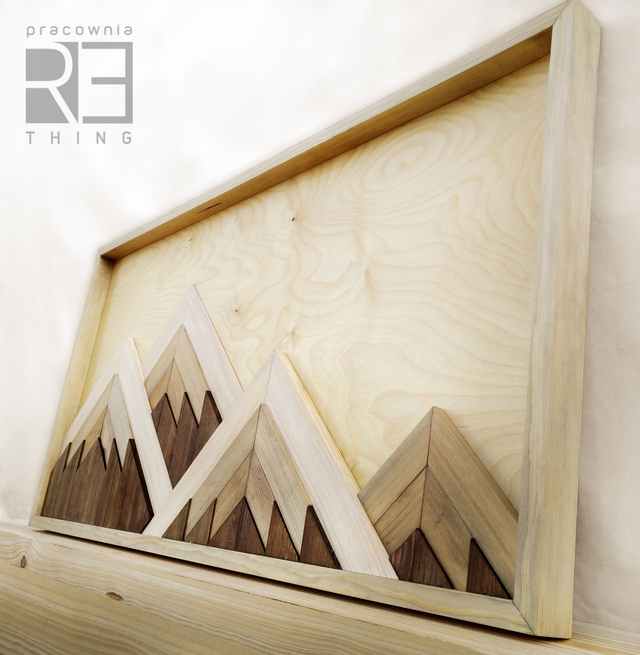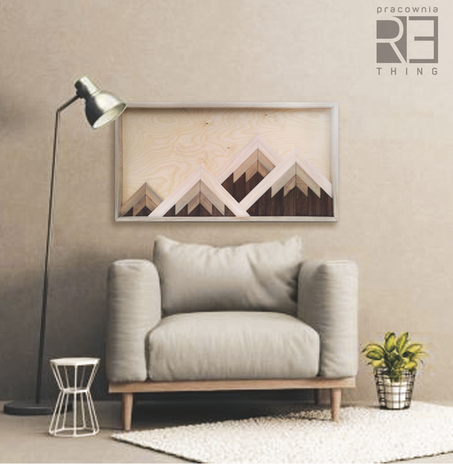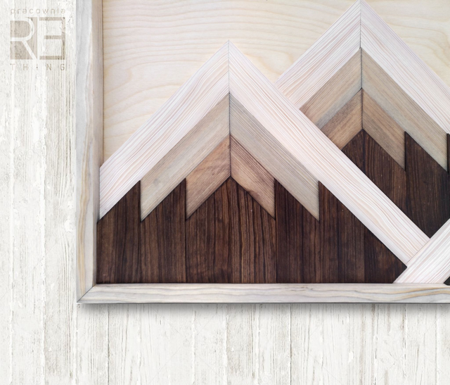 Nowoczesna, a zarazem rustykalna dekoracja ścienna z wyrazistym, górskim akcentem. Ten ręcznie wykonany obraz z drewna przedstawia pasma gór w uproszczonej, geometrycznej formie, bazującej na rytmicznych trójkątach. Minimalistyczny styl i naturalne materiały tworzą spójną całość, która świetnie odnajdzie się w różnych typach wnętrz.