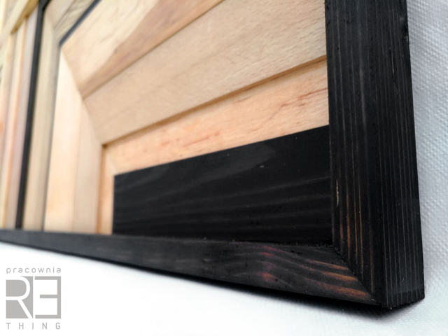 – Część sosnowych listewek barwiona ciemną bejcą, reszta w naturalnych kolorach