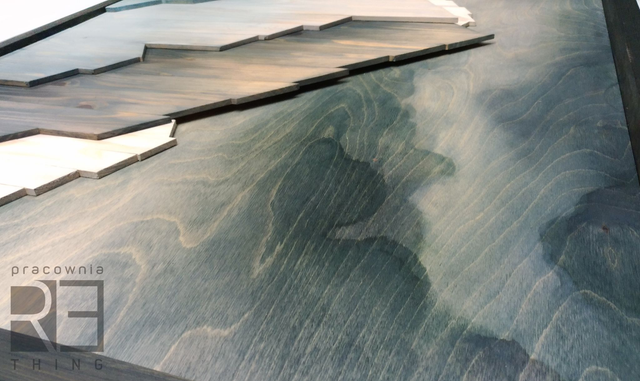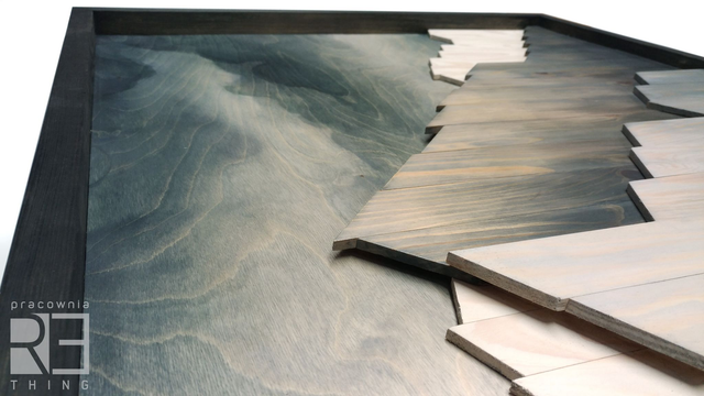 • Warstwowa kompozycja z cienkich sosnowych listewek barwionych bejcą