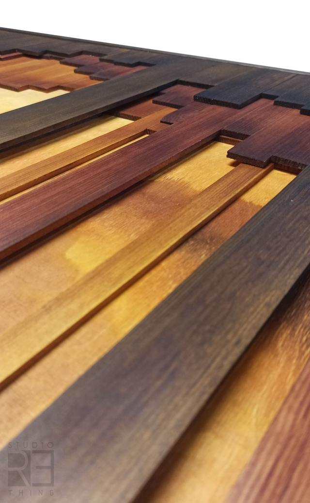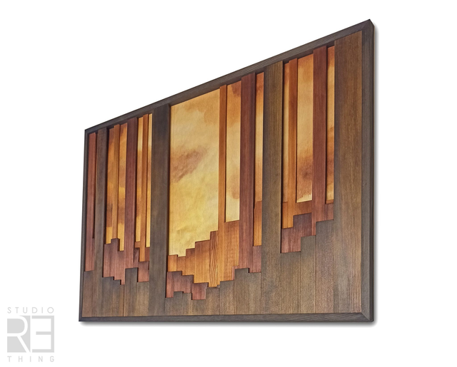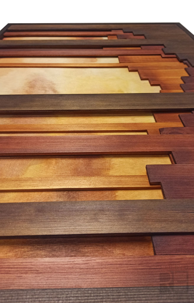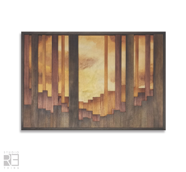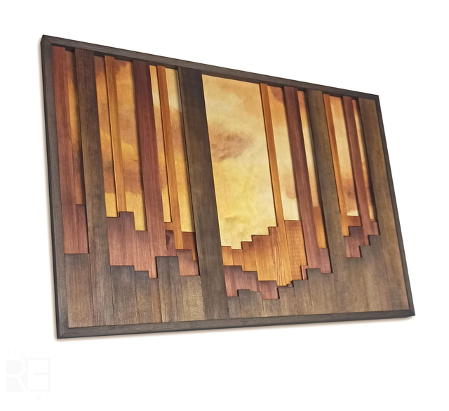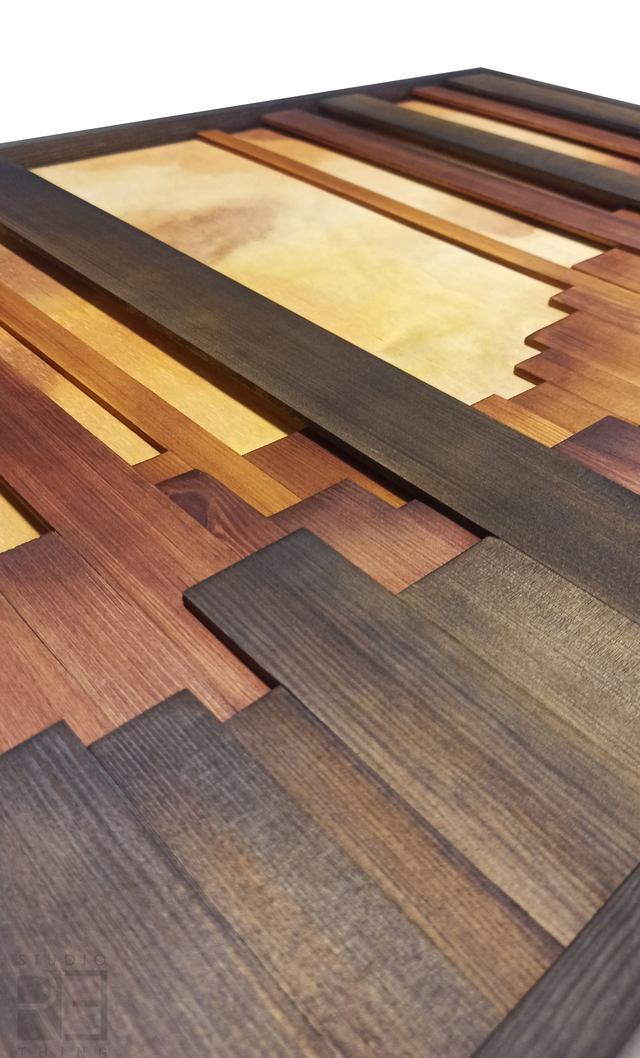 Ręcznie wykonany obraz z drewna, inspirowany leśnym krajobrazem w szczycie jesieni. Ciepłe czerwienie, brązy i złote odcienie przenikają się z delikatnie rozświetlonym niebem w podobnej tonacji, tworząc harmonijną i pełną głębi kompozycję. Geometryczna forma i intensywne kolory czynią z tej drewnianej dekoracji ściennej wyrazisty akcent do każdego wnętrza.