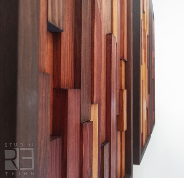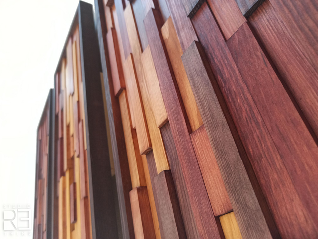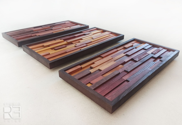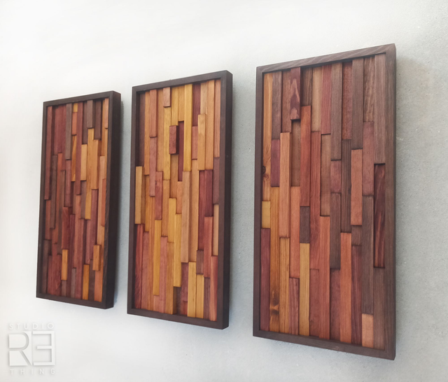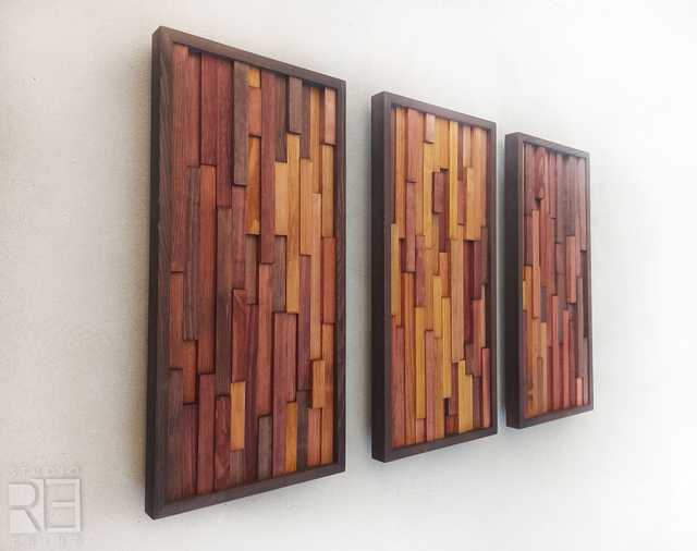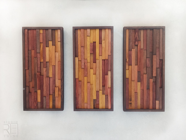 Tryptyk w ciepłych odcieniach żółci, czerwieni i brązu to ręcznie wykonany drewniany obraz, który wnosi do wnętrza energię i harmonię natury. Kompozycja trzech paneli z sosnowych listewek o różnej grubości tworzy efekt przestrzennej głębi i dynamicznej gry światła.
